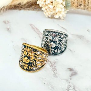 Une chevalière audacieuse en acier inoxydable, ornée d’une tête de lion sertie de strass brillants. Symbole de force, de courage et d’élégance, elle attire tous les regards.