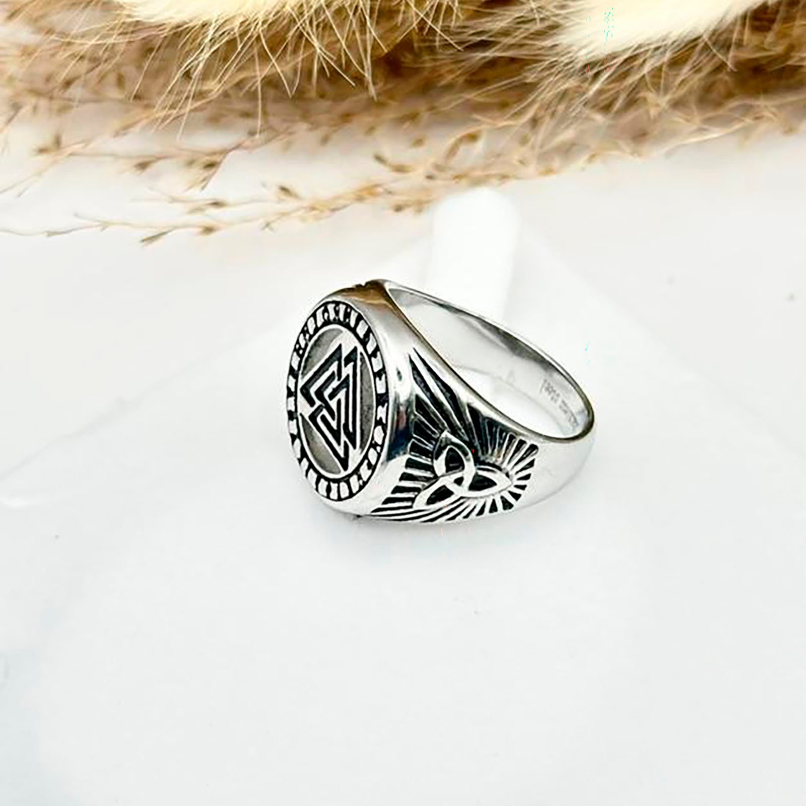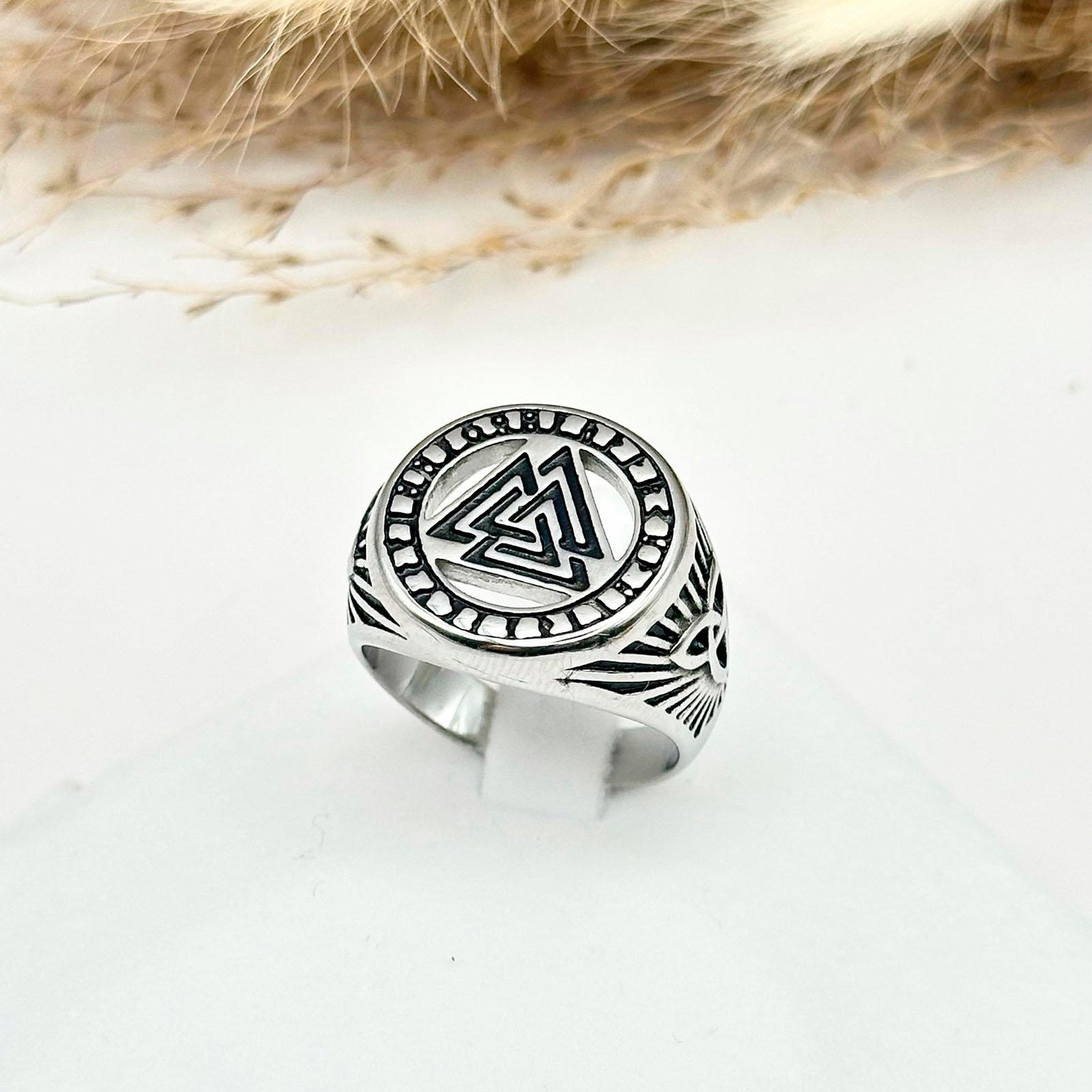 Chevalière masculine en acier inoxydable ornée du symbole viking Valknut, les trois triangles entrelacés d’Odin. Design robuste et intemporel, parfait pour affirmer votre style avec caractère. Résistante et confortable au quotidien.